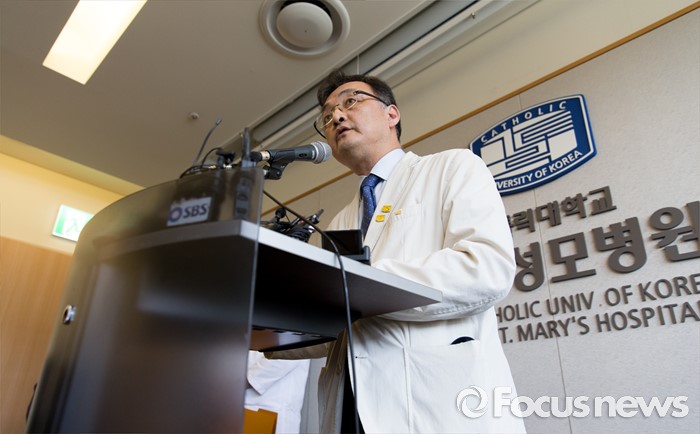 (서울=포커스뉴스) 26일 오후 서울 서초구 서울성모병원에서 장기이식센터장 양철우 교수가 탤런트 김성민 자살시도 관련 브리핑을 하고 있다.