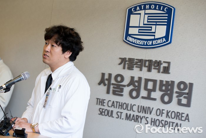 (서울=포커스뉴스) 26일 오후 서울 서초구 서울성모병원에서 서울성모병원 응급의학과 주치의 임지용 교수가 탤런트 김성민 자살시도 관련 브리핑을 하고 있다.