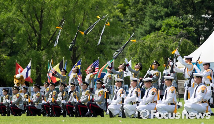 (서울=포커스뉴스) 26일 오후 서울 동작구 국립서울현충원 겨레얼마당에서 국방부 군악대와 의장대가 호국보훈의 달을 맞아 전통의장 및 퍼레이드 시범을 선보이고 있다.