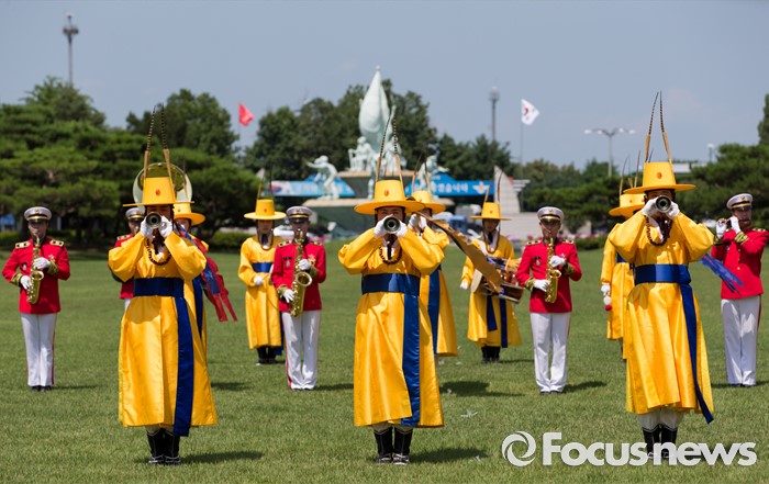 (서울=포커스뉴스) 26일 오후 서울 동작구 국립서울현충원 겨레얼마당에서 국방부 군악대와 의장대가 호국보훈의 달을 맞아 전통의장 및 퍼레이드 시범을 선보이고 있다.