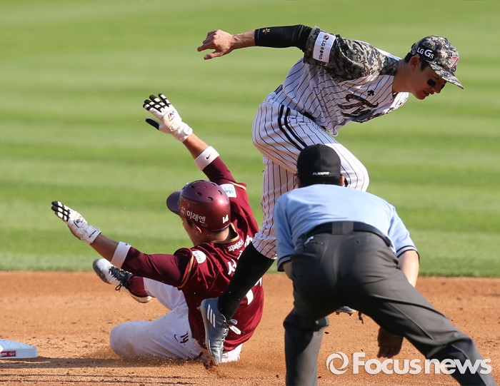 (서울=포커스뉴스) 26일 서울 잠실구장에서 열린 2016 프로야구 넥센-LG 경기 3회초 1사후 내야안타로 진루한 넥센 1루주자 서건창이 고종욱 타석때 2루 도루를 시도하다 LG 유격수 손주인에게 태그아웃되고 있다.