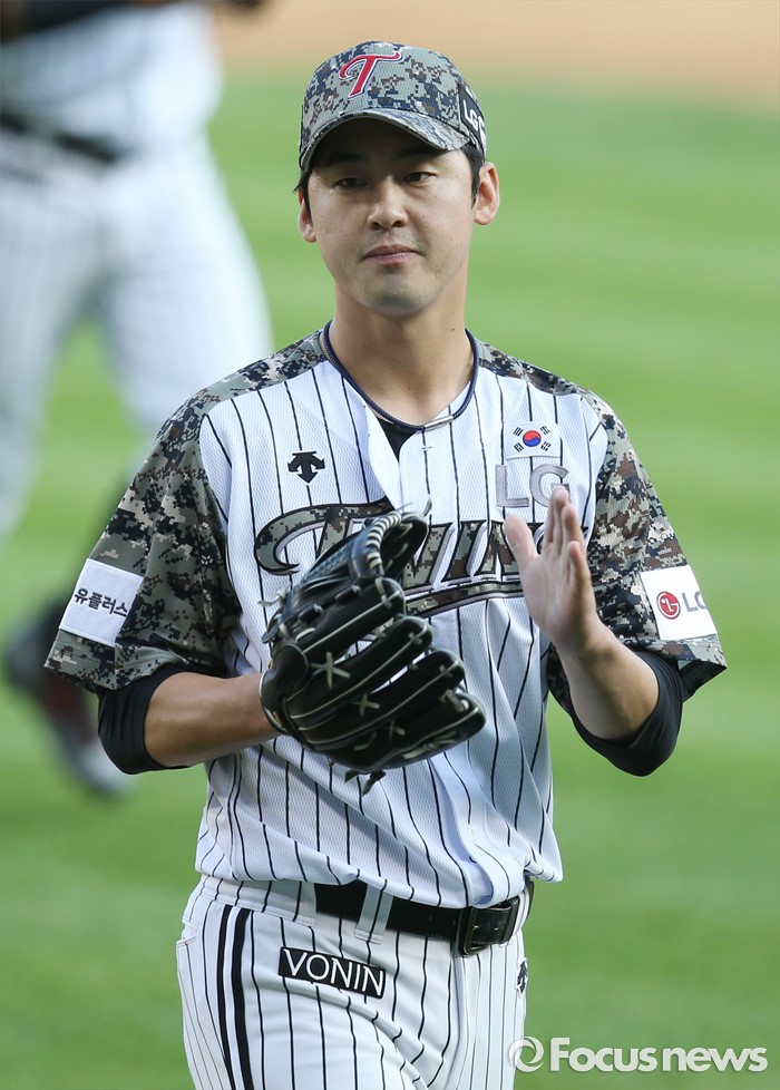 (서울=포커스뉴스) 26일 서울 잠실구장에서 열린 2016 프로야구 넥센-LG 경기 8회초 2사 2루에서 구원 등판한 LG 투수 진해수가 넥센 대타 대니 돈을 삼진아웃 시키고 박수치며 덕아웃으로 향하고 있다.