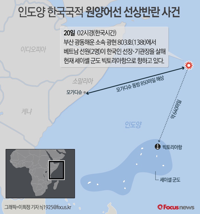 앞서 지난 20일 새벽 인도양 세이셸 군도 북동 650마일 해상을 운항하던 부산 광동해운 소속 138톤 원양어선 광현 803호에서 베트남 선원 2명이 음주 후 난동을 부린 끝에 한국인 선장 양모(43)씨와 기관장 강모(42)씨를 살해하는 사건이 발생했다.
