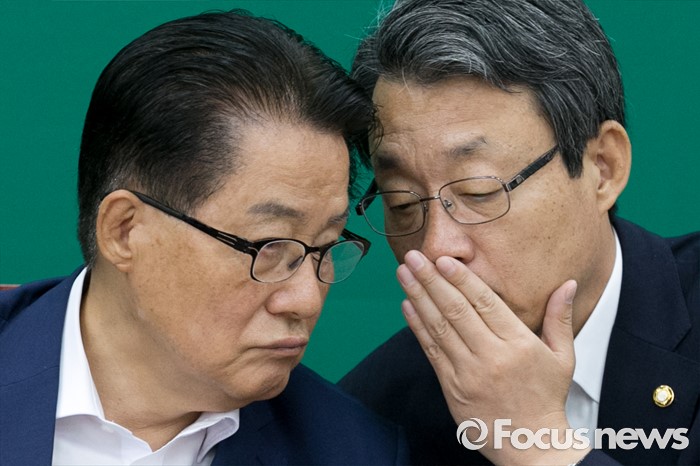 (서울=포커스뉴스) 27일 오전 서울 여의도 국회에서 열린 국민의당 최고위원회의에 참석한 박지원(왼쪽) 원내대표, 김성식 정책위의장이 대화하고 있다.