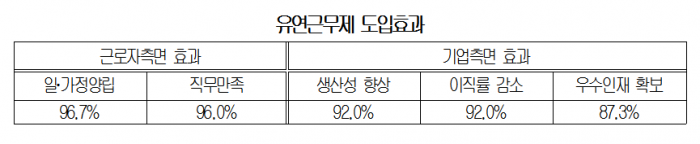 근로자 측면에서 '일·가정 양립에 도움이 되었다'는 응답은 96.7%, '직무 만족도가 높아졌다'는 응답은 96.0%에 달했다. 기업 측면에서도 '생산성 향상'(92.0%), '이직률 감소'(92.0%), '우수인재 확보'(87.3%) 등 긍정적인 효과를 거두는 것으로 나타났다.