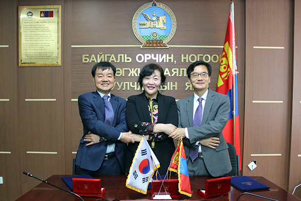 오랜 내전을 겪은 캄보디아엔 30여 차례에 걸쳐 현지 봉사단을 파견했으며, 지난해 인도네시아에서는 저소득층 가정집 40여 채를 개축해 줬다. 몽골엔 2009년부터 국내 유수의 의료진들로 구성된 의료 봉사단을 파견해 현지 주민들의 의료 서비스 향상에 힘써 왔다.왼쪽부터 오기출 푸른아시아 사무총장, 엠 퉁글락 몽골 환경부 산림정책관리국장, 강지형 KT&G복지재단 사무국장이 임농업 교육센터 설립을 위한 업무협력 MOU를 체결한 후 기념촬영하고 있다.<사진제공=KT&G>
