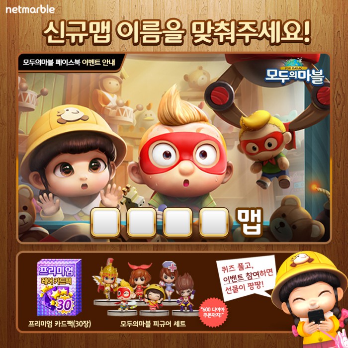 한편 넷마블은 신규 맵을 맞추는 퀴즈 이벤트를 진행한다. 모두의마블을 즐기는 이용자라면 페이스북 댓글을 통해 누구나 참여 가능하다. 넷마블은 해당 게시물의 좋아요 3만 달성 시, 이름을 맞춘 이벤트 참여자를 대상으로 '프리미엄카드팩' 등 게임 내 고급아이템은 물론 전국 온오프라인 매장에서 인기리에 판매되고 있는 모두의마블 피규어 세트 및 600다이아(게임재화)를 추첨을 통해 증정할 예정이다.