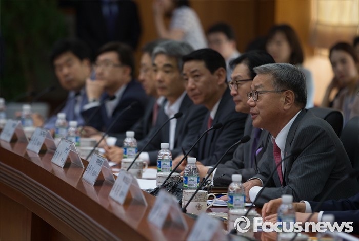 (서울=포커스뉴스) 27일 오전 서울 영등포구 금융투자협회 회의실에서 열린 브렉시트 관련 증권사 사장단 회의에 참석한 황영기 금융투자협회장이 모두발언을 하고 있다.