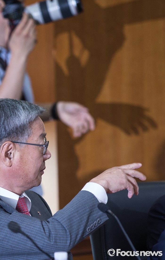 (서울=포커스뉴스) 27일 오전 서울 영등포구 금융투자협회 회의실에서 열린 브렉시트 관련 증권사 사장단 회의에 참석한 황영기 금융투자협회장이 시선을 둘리자 한 카메라기자가 카메라 방향을 바꾸고 있다.