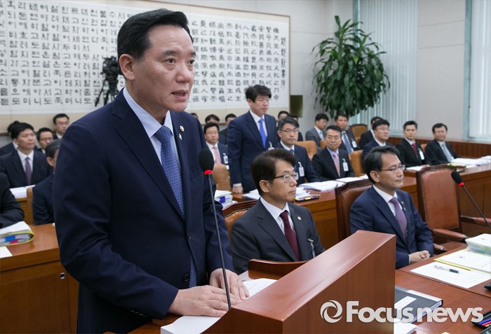 (서울=포커스뉴스) 27일 오전 서울 여의도 국회에서 열린 법제사법위원회 전체회의에 참석한 김현웅 법무부 장관이 업무보고를 하고 있다.