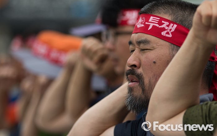 (서울=포커스뉴스) 전국건설노동조합 조합원들이 27일 오전 서울 종로구 정부서울청사 앞에서 7.6 총파업 총력투쟁을 선포하는 구호를 외치고 있다.