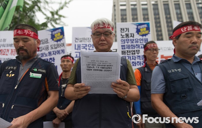 (서울=포커스뉴스) 전국건설노동조합 조합원들이 27일 오전 서울 종로구 정부서울청사 앞에서 7.6 총파업 총력투쟁을 선포하는 기자회견문을 낭독하고 있다.