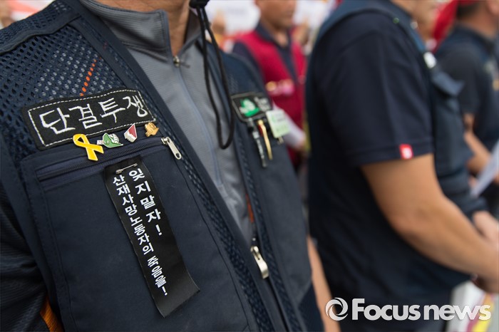 (서울=포커스뉴스) 전국건설노동조합 조합원들이 27일 오전 서울 종로구 정부서울청사 앞에서 7.6 총파업 총력투쟁을 선포하는 기자회견을 하고 있다.