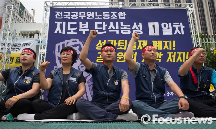 (서울=포커스뉴스) 전국공무원노동조합 조합원들이 27일 오전 서울 종로구 정부서울청사 앞에서 성과퇴출제 폐지, 공무원법 개악 저지 촉구 지도부 단식농성 투쟁 기자회견 후 단식농성에 돌입하고 있다.