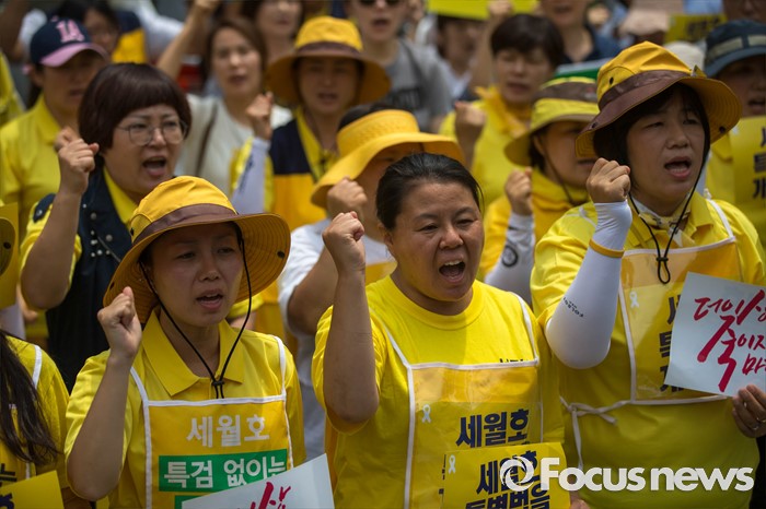 (서울=포커스뉴스) 27일 오후 서울 종로구 청운효자동주민센터 앞에서 416 가족협의회와 416 연대 관계자들이 세월호 특조위 강제해산과 박근혜 정부를 규탄하는 기자회견을 하고 있다.