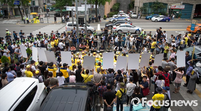 (서울=포커스뉴스) 27일 오후 서울 종로구 청운효자동주민센터 앞에서 416 가족협의회와 416 연대 관계자들이 세월호 특조위 강제해산과 박근혜 정부를 규탄하는 기자회견을 하고 있다.