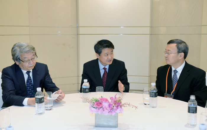 (서울=포커스뉴스) 김학도 산업통상자원부 통상교섭실장이 27일 서울 동대문 메리어트호텔 그랜드볼룸에서 열린 한중일 FTA 10차 협상 수석대표회의에 앞서 왕셔우원(Wang Shouwen) 중국 상무부 부부장, 나가미네 야수마사(Katakami Keiichi) 일본 외무성 경제담당 외무심의관과 미디어세션을 하고 있다. <사진제공=산업통상자원부>