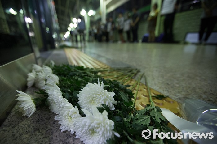| △ 구의역 스크린도어 사망사고 장소에 놓인 국화 |