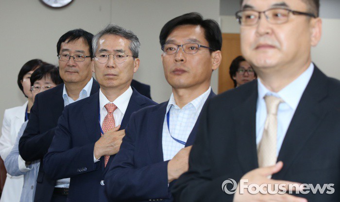 (세종=포커스뉴스) 박준성 최저임금위원회 위원장이 27일 오후 세종시 정부세종청사 고용노동부 전원회의실에서 열린 최저임금위원회 제6차 전원회의에서 국기에 대한 경례를 하고 있다.