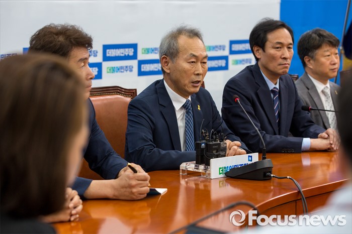 (서울=포커스뉴스) 이석태 세월호특별조사위원회 위원장이 27일 오후 서울 여의도 국회에서 우상호 더불어민주당 원내대표와 면담에 앞서 발언 하고 있다.