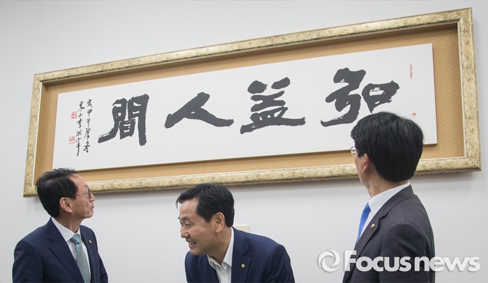 (서울=포커스뉴스) 7월 임시국회 일정 등을 논의하기 위해 모인 여야 3당 원내수석부대표가 27일 오후 서울 여의도 국회에서 국민의당 원내수석부대표실 벽면에 걸린 표구를 보고 있다. 왼쪽부터 김도읍 새누리당, 김관영 국민의당, 박완주 더불어민주당 원내수석부대표