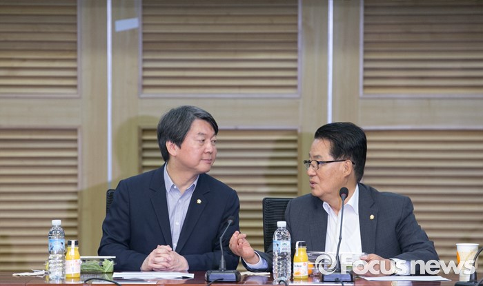 (서울=포커스뉴스) 28일 오전 서울 여의도 국회 의원회관에서 열린 국민의당 20차 정책역량강화 워크숍에 참석한 안철수(왼쪽) 상임공동대표와 박지원 원내대표가 대화하고 있다.