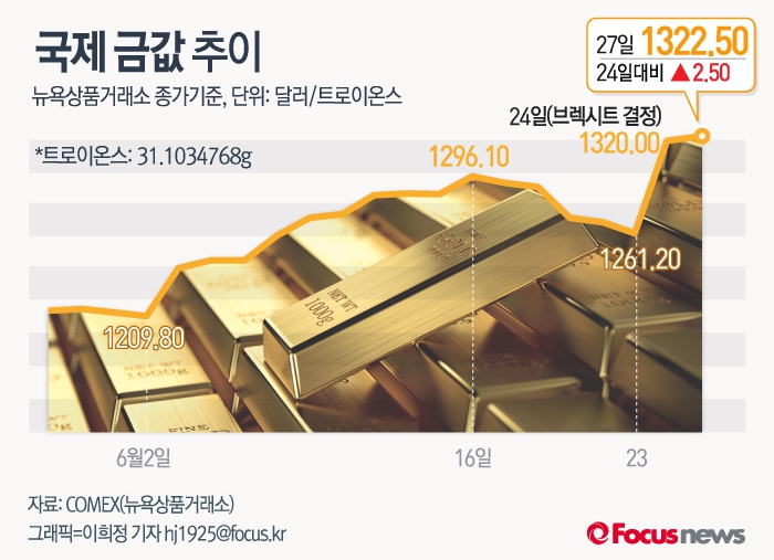 (서울=포커스뉴스) 브렉시트가 발표된 후 안전자산으로 평가받는 금값이 급격히 오르는 추세다. 27일 뉴욕상품거래소 국제 금값은 지난 금요일대비 2.50달러 오른 1322.50달러/트로이온스에 마감했다.