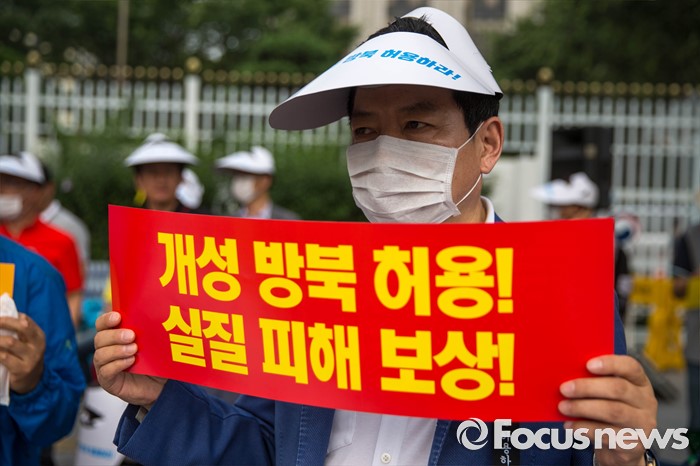 (서울=포커스뉴스) 28일 오전 서울 종로구 정부서울청사 앞에서 개성공단 입주기업 비대위 관계자들이 방북 승인을 촉구하는 집회를 하고 있다.