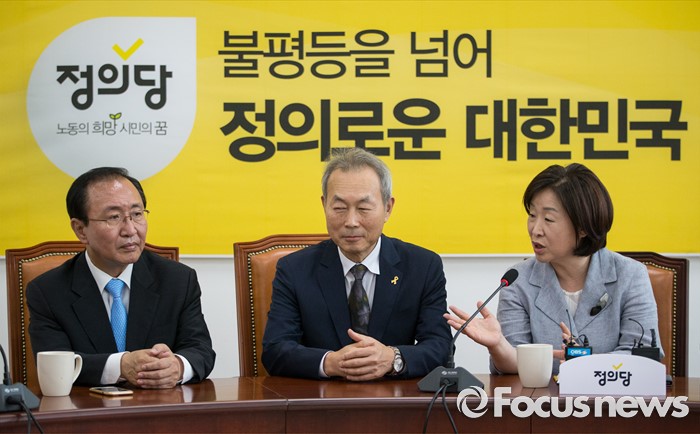 (서울=포커스뉴스) 심상정(오른쪽) 정의당 대표와 노회찬 원내대표가 28일 오전 서울 여의도 국회에서 이석태(가운데) 세월호 특조위 위원장을 접견하고 있다.