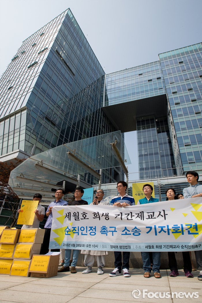 (서울=포커스뉴스) 28일 오전 서울행정법원 앞에서 세월호 희생 기간제교사 순직인정촉구대책위 회원들이 순직 인정 촉구 소송 기자회견을 갖고 있다.
