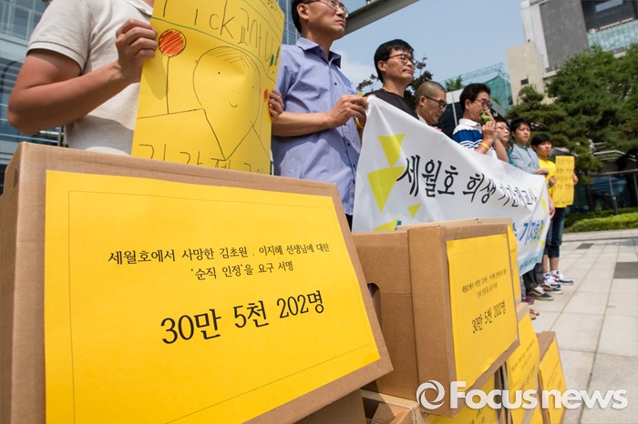 (서울=포커스뉴스) 28일 오전 서울행정법원 앞에서 세월호 희생 기간제교사 순직인정촉구대책위 회원들이 순직 인정 촉구 소송 기자회견을 갖고 있다.