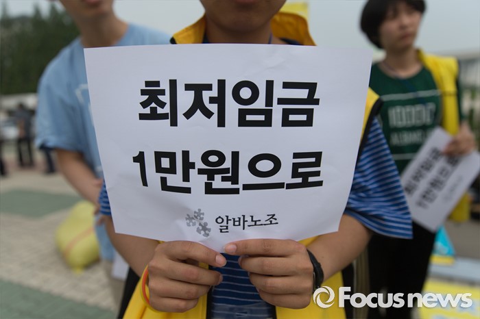 (서울=포커스뉴스) 28일 오전 서울 여의도 국회 앞에서 알바노조 조합원들이 최저임금 1만원 요구 용윤신 사무국장 단식농성 시작 기자회견을 하고 있다.