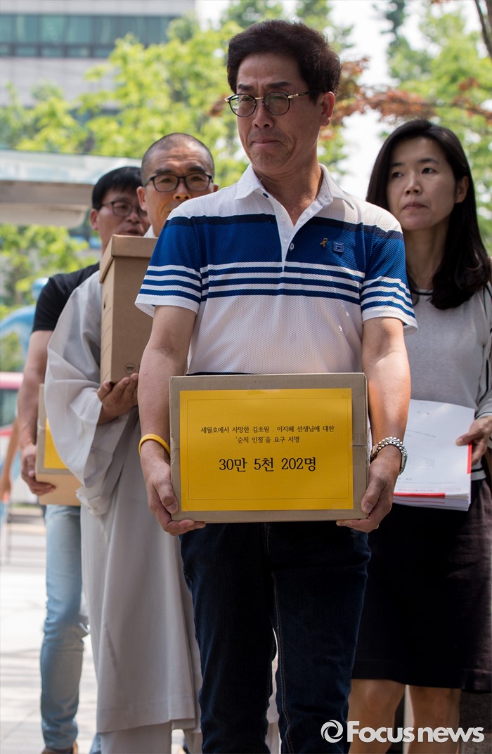(서울=포커스뉴스) 28일 오전 서울행정법원 앞에서 세월호 희생 기간제교사 순직인정촉구대책위 회원들이 순직 인정 촉구 소송 기자회견을 마친 후 소장과 순직 인정 요구 서명지 상자를 법원에 전달하고 있다.