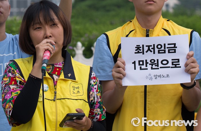 (서울=포커스뉴스) 28일 오전 서울 여의도 국회 앞에서 이가현 알바노조 대학사업팀장이 최저임금 1만원 요구 용윤신 사무국장 단식농성 시작 기자회견 중 발언하고 있다.