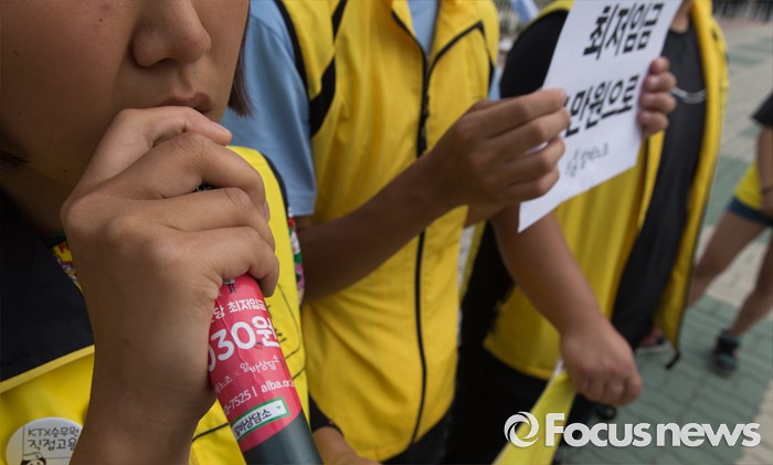 (서울=포커스뉴스) 28일 오전 서울 여의도 국회 앞에서 알바노조 조합원들이 최저임금 1만원 요구 용윤신 사무국장 단식농성 시작 기자회견을 하고 있다.