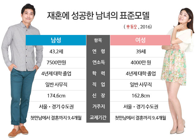 이에 따르면, 재혼한 남성 표준모델은 △43.2세 △연소득 약 7500만원 △4년제 대졸 △신장 174.6cm △일반 사무직이었으며, 여성은 △39세 △연소득 약 4000만원 △4년제 대졸 △신장 162.8cm △일반 사무직 종사자였다.