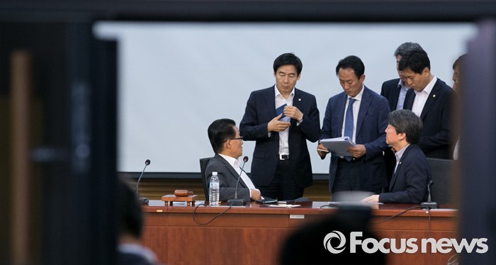 (서울=포커스뉴스) 28일 오전 서울 여의도 국회 의원회관에서 왕주현 전 사무부총장 구속 등 리베이트 수수 의혹 관련 비공개 국민의당 의원총회를 마친 안철수 상임공동대표, 천정배 공동대표, 박지원 원내대표 등 의원들이 논의하고 있다.