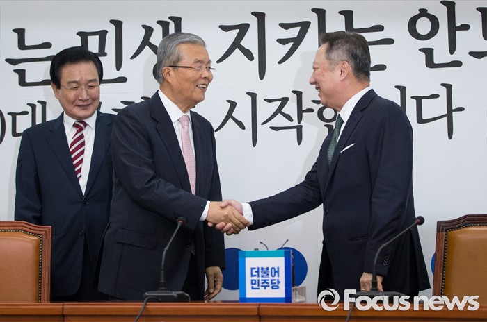 (서울=포커스뉴스) 김종인(왼쪽 두번재) 더불어민주당 비상대책위원회 대표가 28일 오전 서울 여의도 국회에서 박용만(오른쪽) 대한상공회의소 회장과 인사하고 있다.