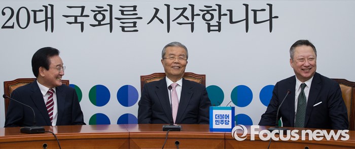 (서울=포커스뉴스) 김종인(가운데) 더불어민주당 비상대책위원회 대표와 변재일 정책위의장이 28일 오전 서울 여의도 국회에서 박용만(오른쪽) 대한상공회의소 회장을 접견하고 있다.