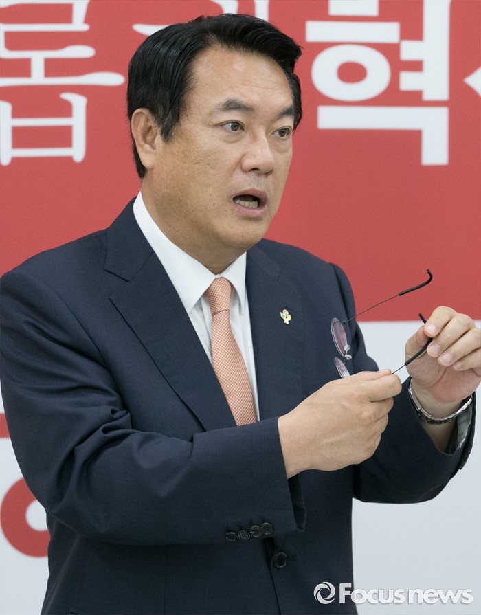 (서울=포커스뉴스) 28일 오전 서울 여의도 국회에서 정진석 새누리당 원내대표가 박용만 대한상공회의소 회장을 기다리며 취재진에게 안경에 대한 설명을 하고 있다.
