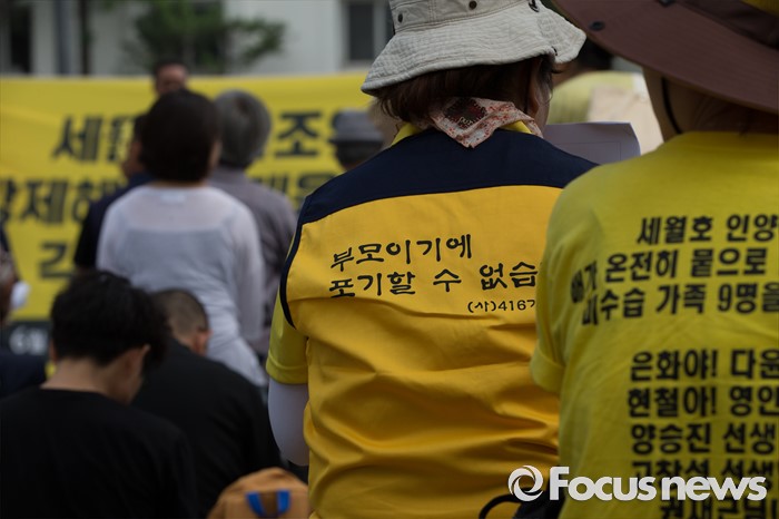 (서울=포커스뉴스) 28일 오전 서울 종로구 정부서울청사 인근 공원에서 열린4.16가족협의회·4.16연대 '세월호 특조위 강제해산에 대응하는 각계 긴급 회의'에 가족협의회 및 시민들이 참석하고 있다.