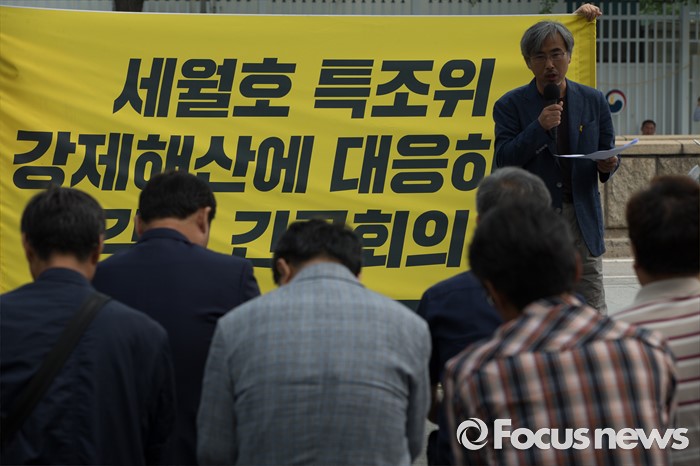 (서울=포커스뉴스) 28일 오전 서울 종로구 정부서울청사 인근 공원에서 열린4.16가족협의회·4.16연대 '세월호 특조위 강제해산에 대응하는 각계 긴급 회의'에 가족협의회 및 시민들이 참석하고 있다.
