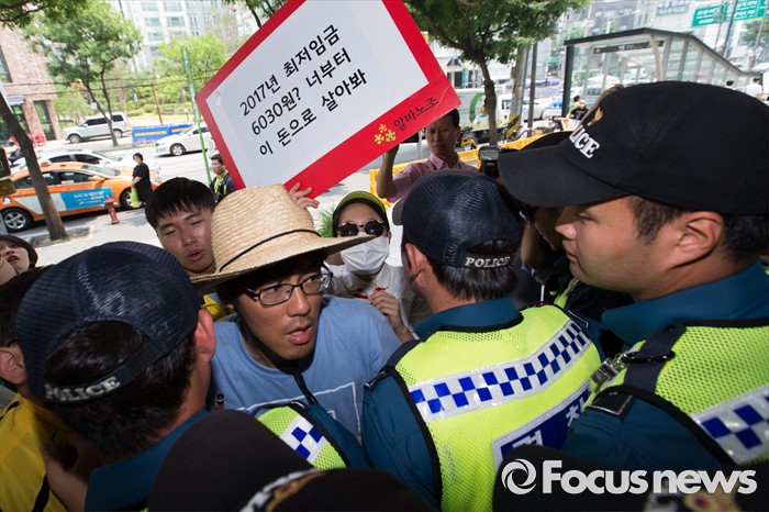 (서울=포커스뉴스) 28일 오전 서울 마포구 한국경영자총연합회 회관 앞에서 알바노조 조합원들이 10년 연속 최저임금 동결을 주장하는 경총에 항의방문 하자 경찰이 막고 있다.