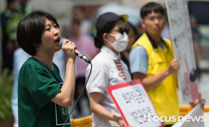 (서울=포커스뉴스) 28일 오전 서울 마포구 한국경영자총연합회 회관 앞에서 알바노조 조합원들이 10년 연속 최저임금 동결을 주장하는 경총에 항의방문 전 발언 하고 있다.