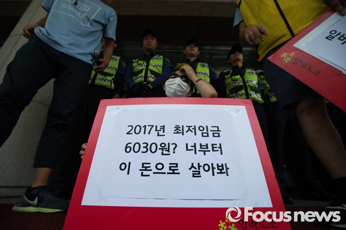 (서울=포커스뉴스) 28일 오전 서울 마포구 한국경영자총연합회 회관 앞에서 알바노조 조합원들이 10년 연속 최저임금 동결을 주장하는 경총에 항의방문 하자 경찰이 막고 있다.