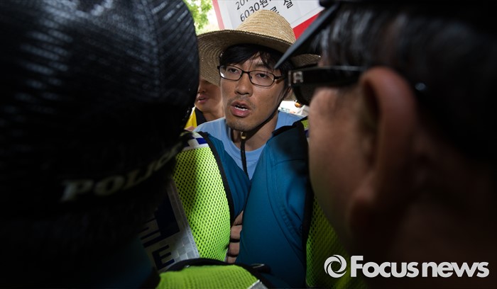 (서울=포커스뉴스) 28일 오전 서울 마포구 한국경영자총연합회 회관 앞에서 알바노조 조합원들이 10년 연속 최저임금 동결을 주장하는 경총에 항의방문 하자 경찰이 막고 있다.