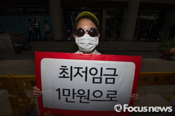(서울=포커스뉴스) 28일 오전 서울 마포구 한국경영자총연합회 회관 앞에서 알바노조 조합원들이 10년 연속 최저임금 동결을 주장하는 경총에 항의방문 하고 있다.