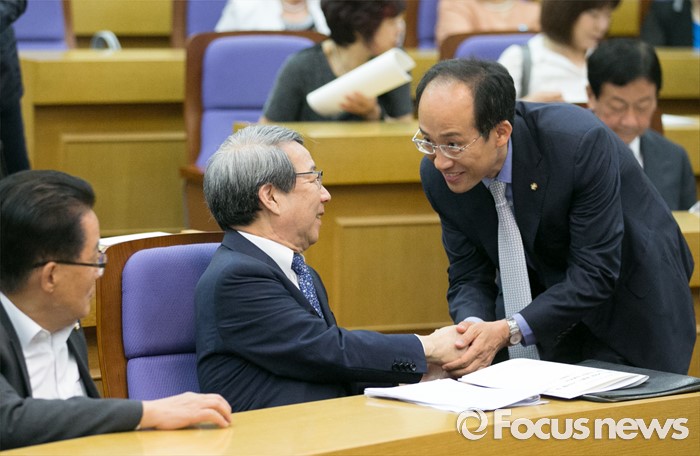 (서울=포커스뉴스) 28일 오전 서울 여의도 국회 의원회관에서 열린 '한국적 제3의 길' 창립 기념 초청 강연, '한국경제와 20대 국회가 가야할 길'에 참석한 정운찬(가운데) 동반성장연구소 이사장과 추경호(오른쪽) 새누리당 의원이 인사하고 있다. 왼쪽은 박지원 국민의당 원내대표.