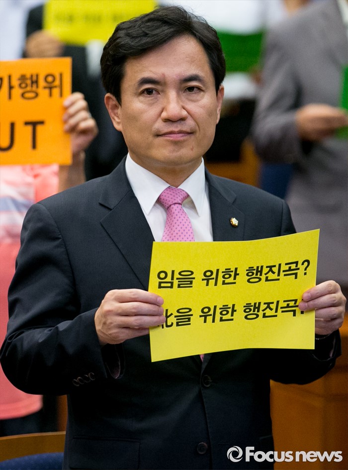 (서울=포커스뉴스) 28일 오전 서울 여의도 국회 헌정기념관에서 열린 '임을 위한 행진곡' 기념곡 지정저지 범국민대책본부 출범식 및 결의대회에 참석한 김진태 새누리당 의원이 피켓을 들고 있다.