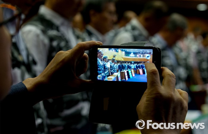(서울=포커스뉴스) 28일 오전 서울 여의도 국회 헌정기념관에서 열린 '임을 위한 행진곡' 기념곡 지정저지 범국민대책본부 출범식 및 결의대회에 참석한 한 관계자가 핸드폰으로 촬영을 하고 있다.